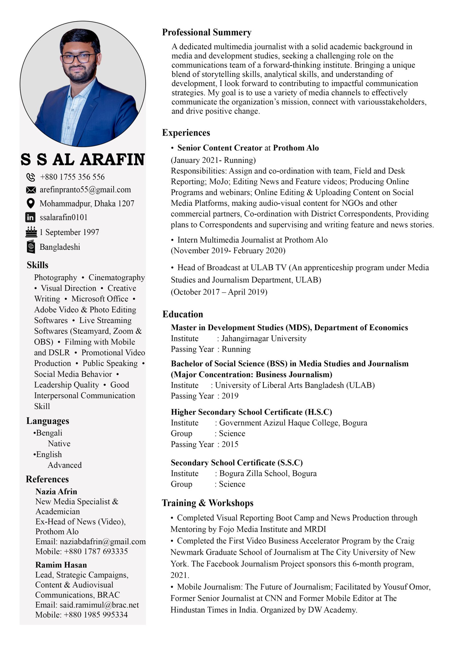 I am a Bangladeshi journalist. New media, the most modern form of journalism, is my field of work. I have been working for a leading national media outlet for last 6 years. Besides news content and feature content, I have also created various commercial content for digital platform. I also have expertise in presentation, live presentation, and voice-over.